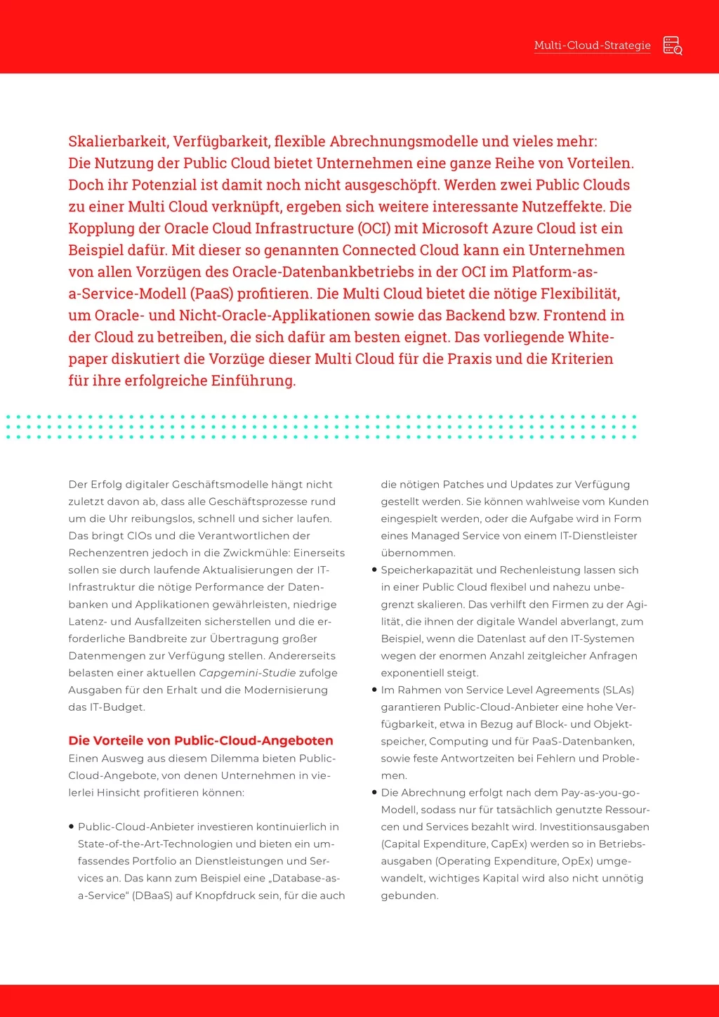 Die Multi Cloud bietet die nötige Flexibilität, um Oracle- und Nicht-Oracle-Applikationen sowie das Backend bzw. Frontend in der Cloud zu betreiben, die sich dafür am besten eignet. Das vorliegende Whitepaper diskutiert die Vorzüge dieser Multi-Cloud für die Praxis und die Kriterien für ihre erfolgreiche Einführung.