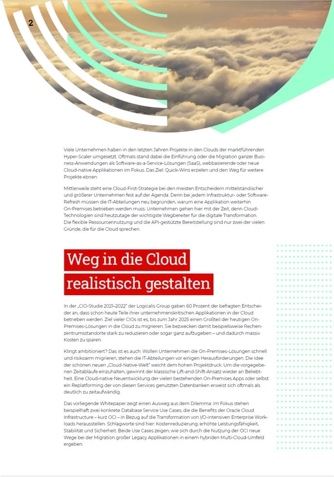 Wollen Unternehmen Ihre On-Premises-Lösungen schnell und risikoarm migrieren, stehen die IT-Abteilungen vor einigen Herausforderungen. Das vorliegende Whitepaper zeigt einen Ausweg aus dem Dilemma: Im Fokus stehen beispielhaft zwei konkrete Database Service Use Cases, die die Benefits der Oracle Cloud Infrastructure – kurz OCI – in Bezug auf die Transformation von I/O-intensiven Enterprise Workloads herausstellen.